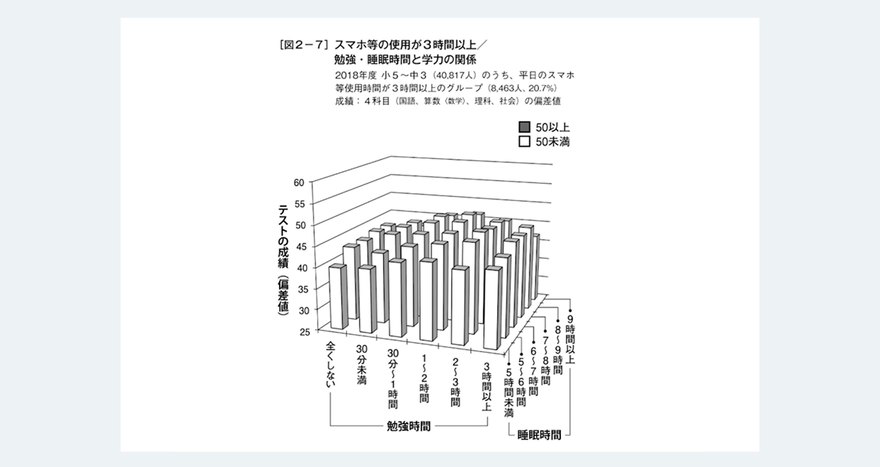 『スマホはどこまで脳を壊すか』で詳しくご紹介したとおり、子どもを対象にした調査で「1日3時間以上スマホを使用した子どもたちは、きちんと睡眠時間や勉強時間を確保していても、平均すると成績が平均未満である」ことがわかりました。